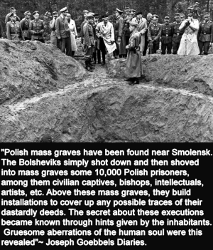 I believe the earnest young man's eyes would open wide. Even without me telling him, that many of the slaughtered officers were retrieved from their silent forest graves? With their hands tied behind their backs, most cruelly, with barbed wire. With evidence of brutal torture. Their eyes gouged out. That an attempt was made, outrageously, to later blame this on the Germans. That FDR, the jewish American President? Himself surrounded by jewish advisers? The man responsible for force-dragging a heavily reluctant America into WW2? Via the Pearl Harbor back door? In which he deliberately sacrificed Americans? If I told my young Fascist friend? That FDR knew, early on, exactly who had committed the Katyn massacre. But that he kept silent. For fear of alienating the Polish voter base... Ah, such cynicism.