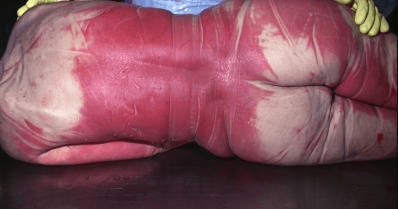 Fig. 10.9.2: Bright red lividity on the dorsal side of the body as the expression of lethal carbon monoxide poisoning.